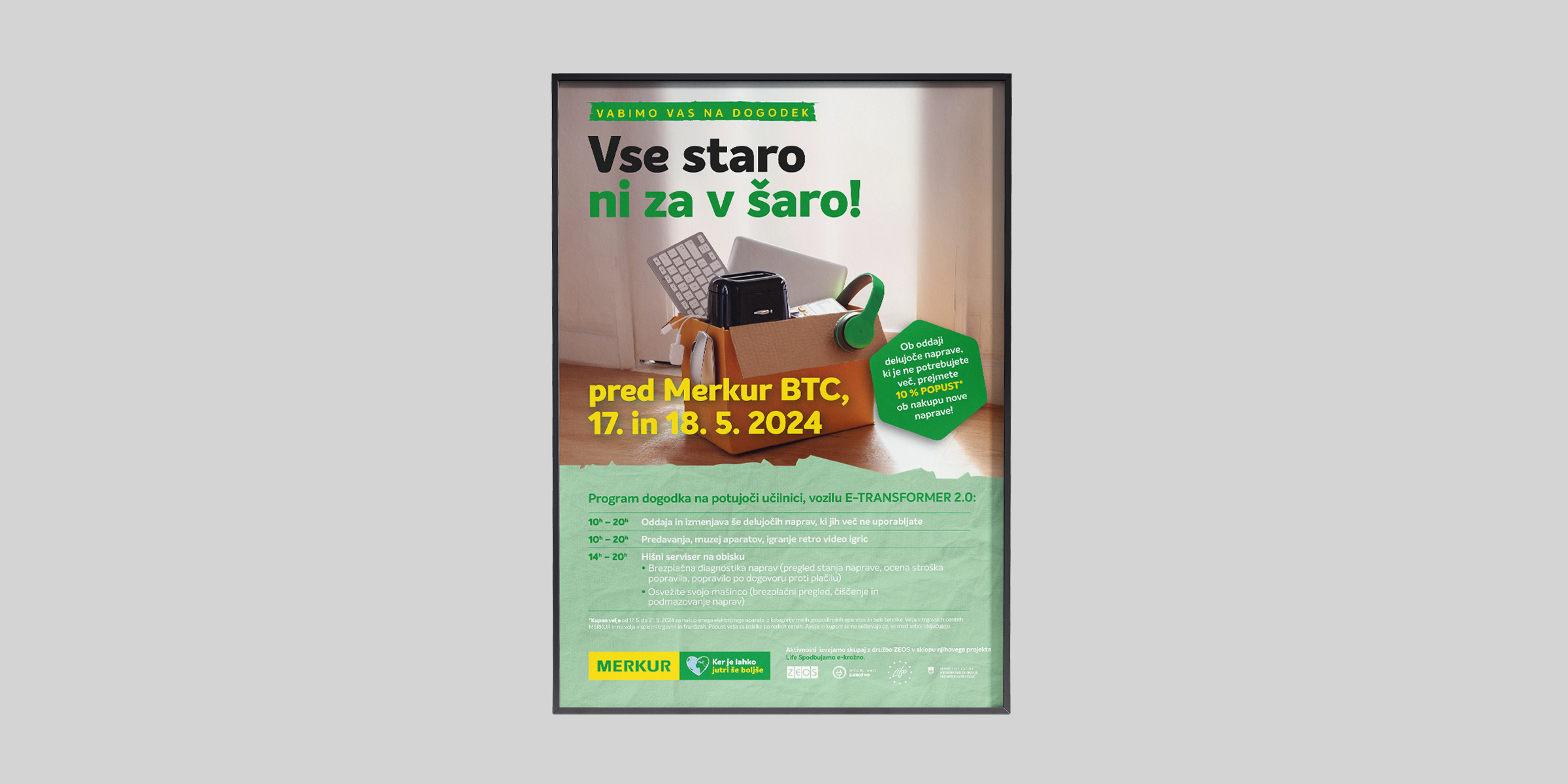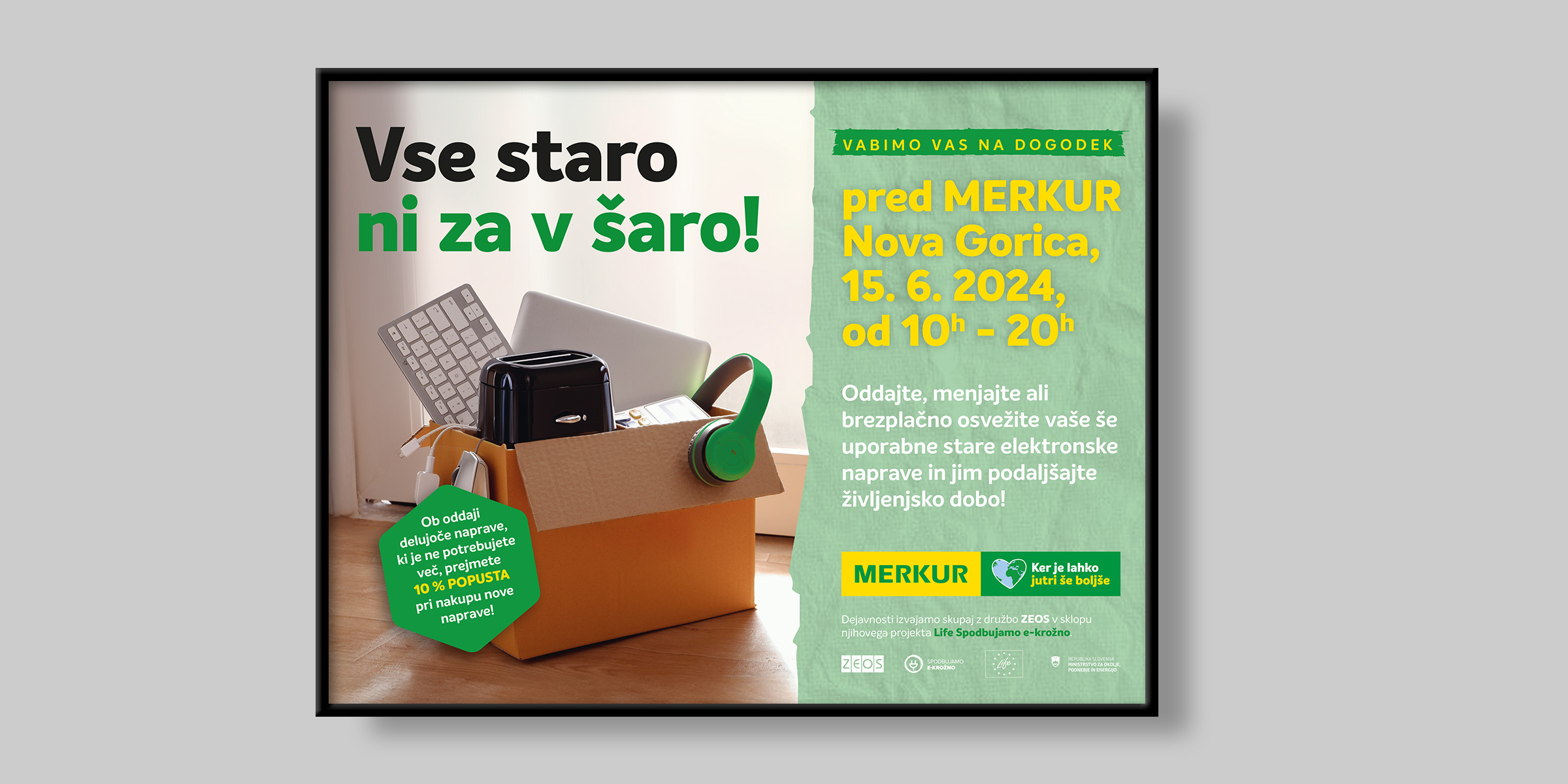 Znotraj trajnostne pobude smo ustvarili podobo aktivnosti, ki se odvija v trgovskih centrih Merkur in vabi ljudi k recikliranju vseh starih, nedelujočih aparatov, sijalk ali baterij. Kampanja se je odvijala na družabnih omrežjih, tiskanih oglasih in obcestnih plakatih.